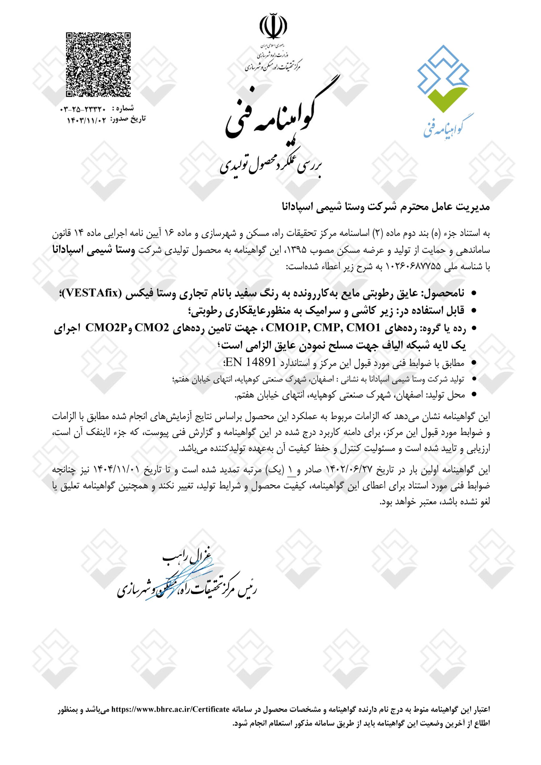 همچنین این شرکت در راستاي انجام وظيفه و رسالت خود در تولید انواع مواد شیمیایی ساختمانی ، با هدف جلب اعتماد و افزایش رضایت مشتریان، بهبود مستمر و ارتقاء کیفیت محصولات خود را در دستور کار قرار داده است.